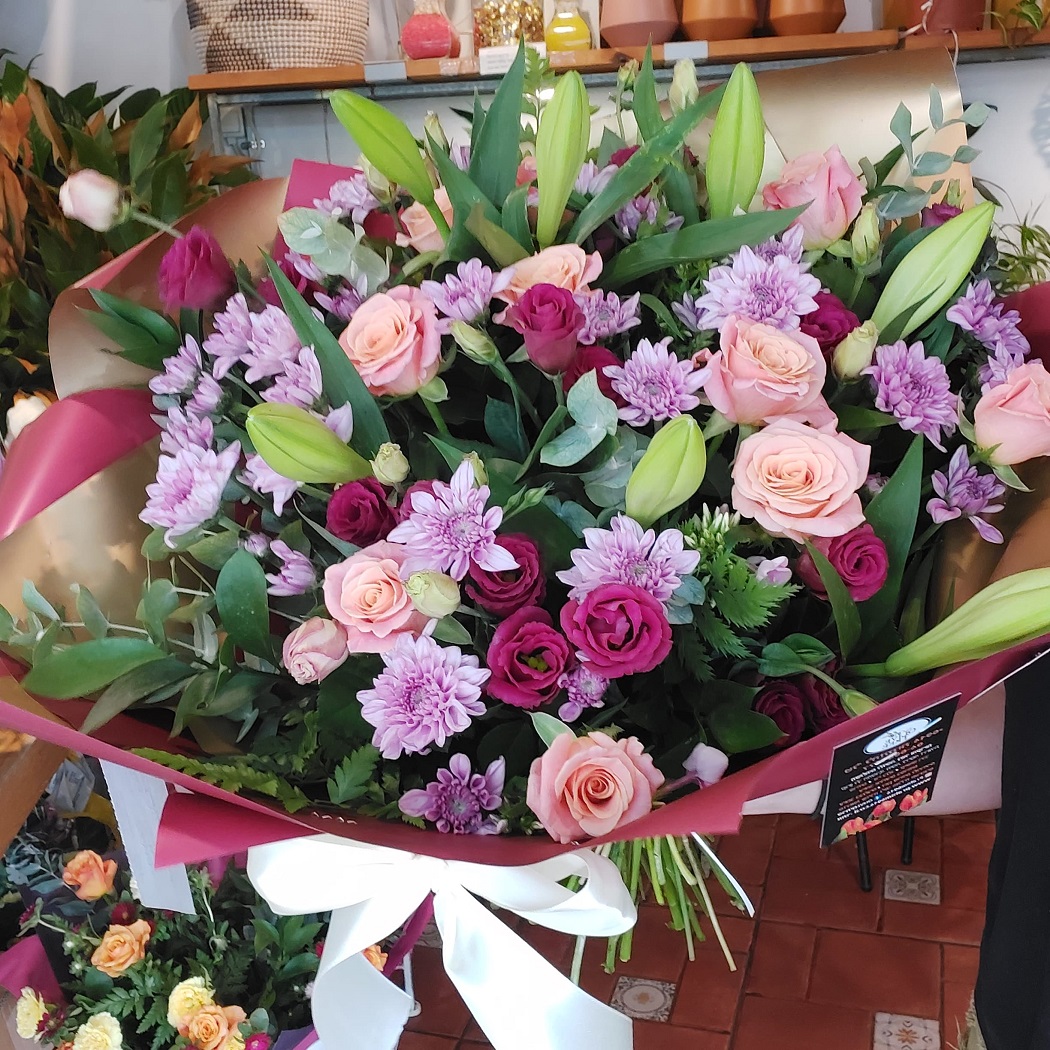 מגוון פרחים ורודים , ליזיאנטוס, חרצית , ורדים, שושן צחור ועוד. יתכנו שינויים בסוגי הפרחים, בהתאם למלאי הטרי של אותו הבוקר ותוך שמירה על אופי הזר